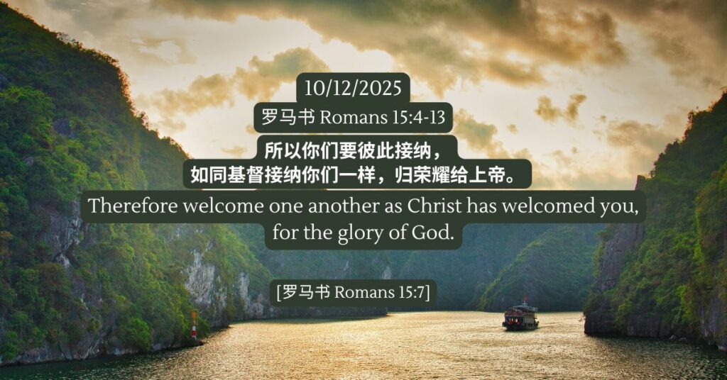 Today’s devotion passage begins and ends with God-given hope (vv. 4, 12–13). It is filled with exhortations to glorify God for His work through Jesus Christ (vv. 6–7, 9). At its centre, it urges believers to welcome one another, just as Christ has welcomed them (v. 7).