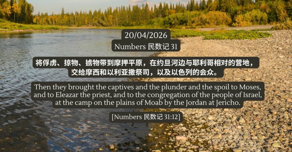 Then they brought the captives and the plunder and the spoil to Moses, and to Eleazar the priest, and to the congregation of the people of Israel, at the camp on the plains of Moab by the Jordan at Jericho. – Numbers 31:12
