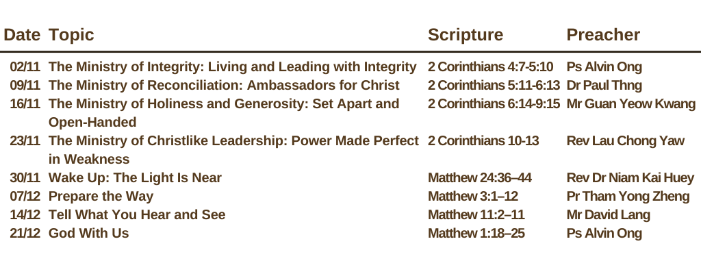 Visit us at our Sunday worship services that are available in Foochow, Mandarin, Tamil and English. As God leads you, come participate in our outreach programs such as tuition for children, food distribution for the needy, outreach to migrant workers and activities for senior citizens.