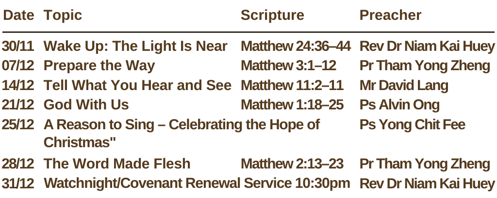 Visit us at our Sunday worship services that are available in Foochow, Mandarin, Tamil and English. As God leads you, come participate in our outreach programs such as tuition for children, food distribution for the needy, outreach to migrant workers and activities for senior citizens.