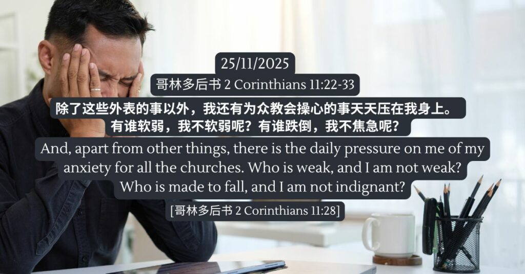 2 Corinthians 11:22–33 And, apart from other things, there is the daily pressure on me of my anxiety for all the churches. Who is weak, and I am not weak? […]
