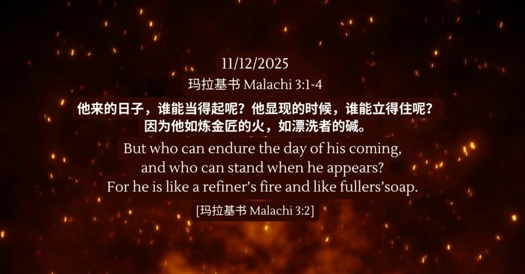 他来的日子,谁能当得起呢?他显现的时候,谁能立得住呢?因为他如炼金匠的火,如漂洗者的碱。- 玛拉基书 3:2