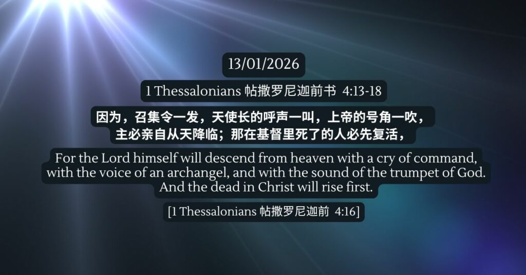 帖撒罗尼迦前书 4:13-18 发表评论 / 帖撒罗尼迦前书, 旧约, 陪你一起吃灵粮 / 13/01/2026 帖撒罗尼迦前书 4:13-18 因为,召集令一发,天使长的呼声一叫,上帝的号角一吹,主必亲自从天降临;那在基督里死了的人必先复活,- 帖撒罗尼迦前书 4:16