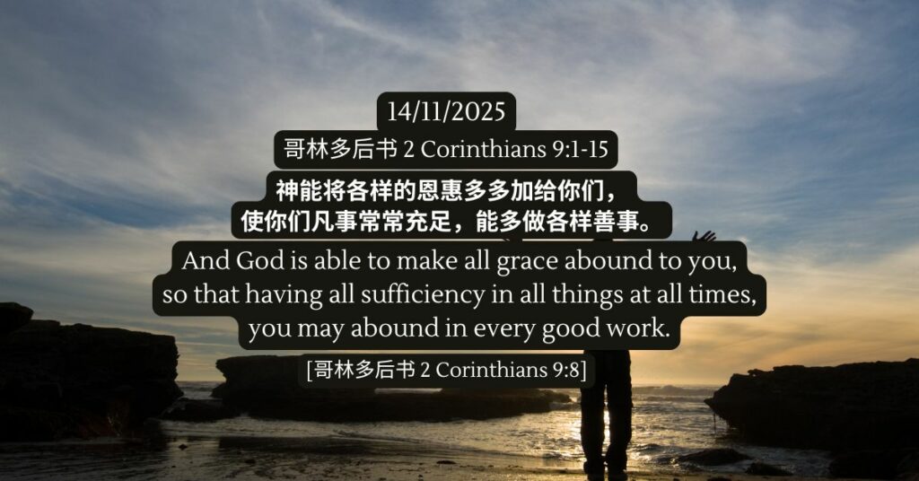 神能将各样的恩惠多多加给你们,使你们凡事常常充足,能多做各样善事。- 哥林多后书 9:8