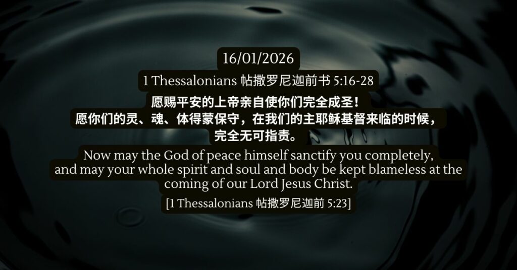 帖撒罗尼迦前书 5:16-28 发表评论 / 帖撒罗尼迦前书, 旧约, 陪你一起吃灵粮 / 16/01/2026 帖撒罗尼迦前书 5:16-28 愿赐平安的上帝亲自使你们完全成圣!愿你们的灵、魂、体得蒙保守,在我们的主耶稣基督来临的时候,完全无可指责。- 帖撒罗尼迦前书 5:23-
