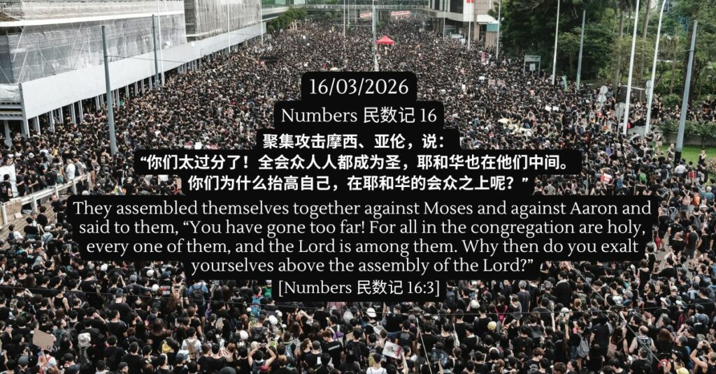 民数记 16 发表评论 / 旧约, 民数记, 陪你一起吃灵粮 / 16/03/2026 民数记 16 聚集攻击摩西、亚伦,说:“你们太过分了!全会众人人都成为圣,耶和华也在他们中间。你们为什么抬高自己,在耶和华的会众之上呢?” – 民数记 16:3