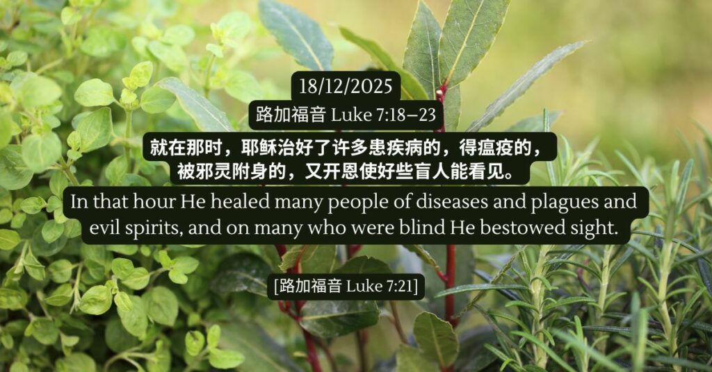 就在那时,耶稣治好了许多患疾病的,得瘟疫的,被邪灵附身的,又开恩使好些盲人能看见。- 路加福音 7:21