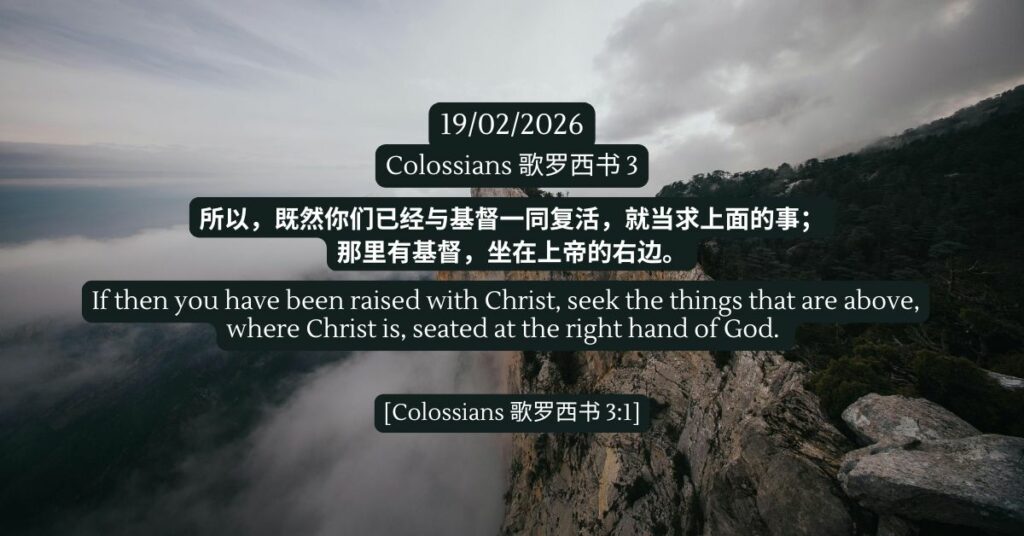 歌罗西书 3 发表评论 / 新约, 歌罗西书, 陪你一起吃灵粮 / 19/02/2026 歌罗西书 3 所以,既然你们已经与基督一同复活,就当求上面的事;那里有基督,坐在上帝的右边。- 歌罗西书 3:1