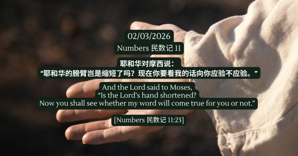 民数记 11 发表评论 / 旧约, 民数记, 陪你一起吃灵粮 / 02/03/2026 民数记 11 耶和华对摩西说:“耶和华的膀臂岂是缩短了吗?现在你要看我的话向你应验不应验。” – 民数记 11:23