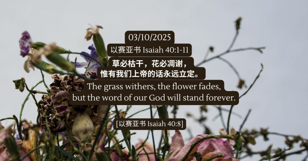 以赛亚书 40:1-11 发表评论 / 以赛亚书, 旧约, 陪你一起吃灵粮 / 03/10/2025 以赛亚书 40:1-11 草必枯干,花必凋谢,惟有我们 上帝 […] 以赛亚书 40:1-11 Read More »