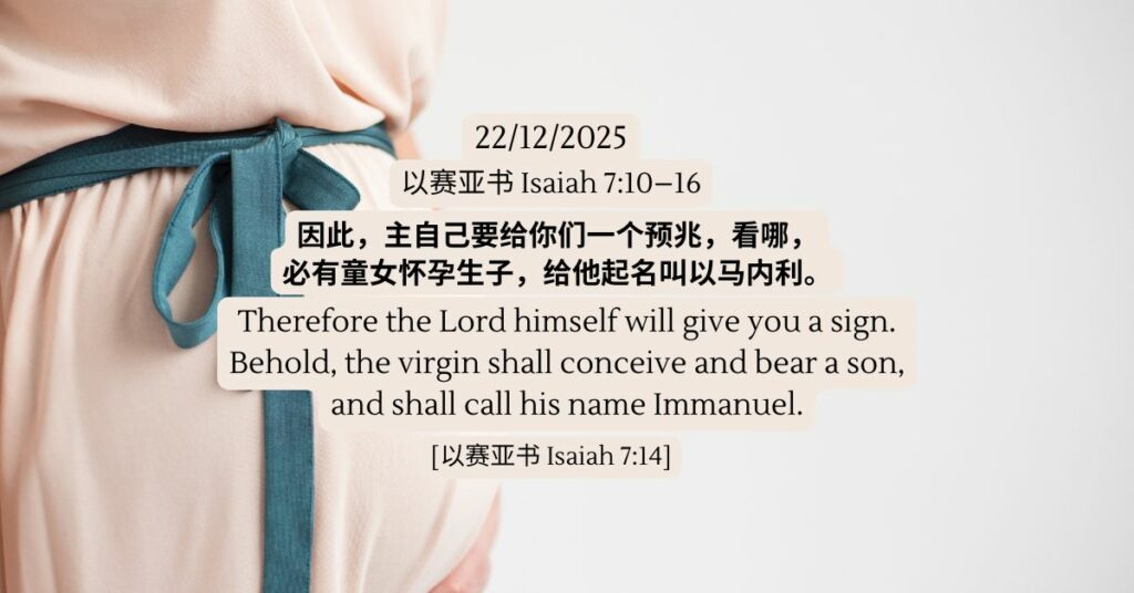 以赛亚书 7:10–16 发表评论 / 以赛亚书, 旧约, 陪你一起吃灵粮 / 22/12/2025 以赛亚书 7:10–16 因此,主自己要给你们一个预兆,看哪 […] 以赛亚书 7:10–16 Read More »