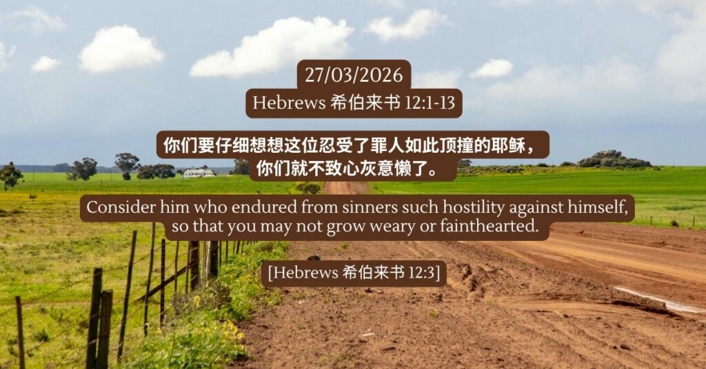 希伯来书 12:1-13 发表评论 / 希伯来书, 新约, 陪你一起吃灵粮 / 27/03/2026 希伯来书 12:1-13 你们要仔细想想这位忍受了罪人如此顶撞的耶稣,你们就不致心灰意懒了。- 希伯来书 12:3