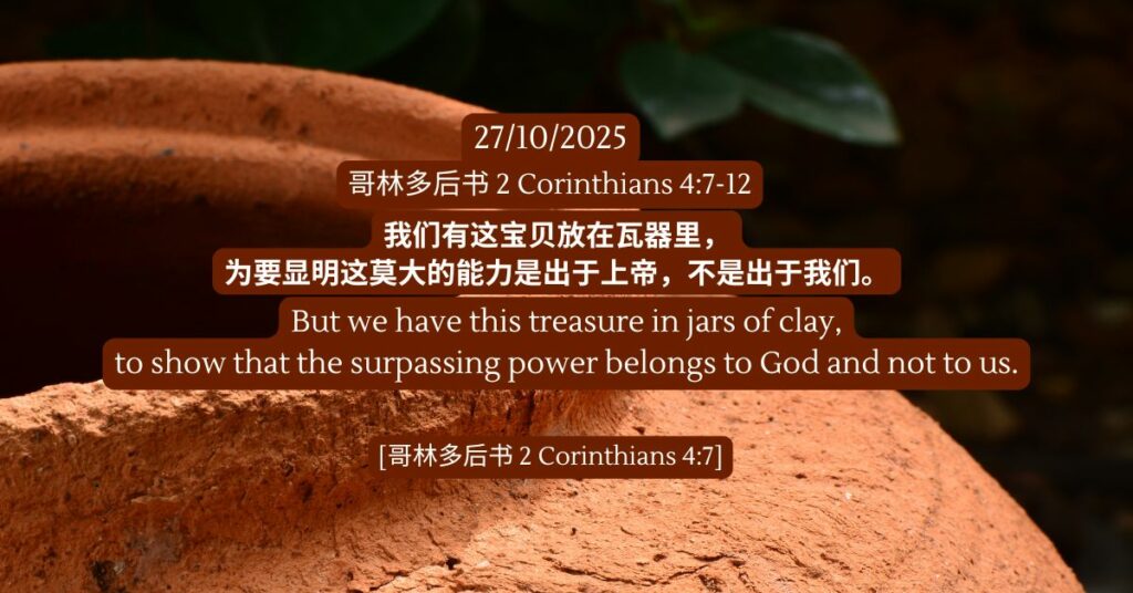 哥林多后书 4:7-12 发表评论 / 哥林多后书, 旧约, 陪你一起吃灵粮 / 27/10/2025 哥林多后书 4:7-12 我们有这宝贝放在瓦器里,为要显明这莫大的能力是出于上帝,不是出于我们。 – 哥林多后书 4:7