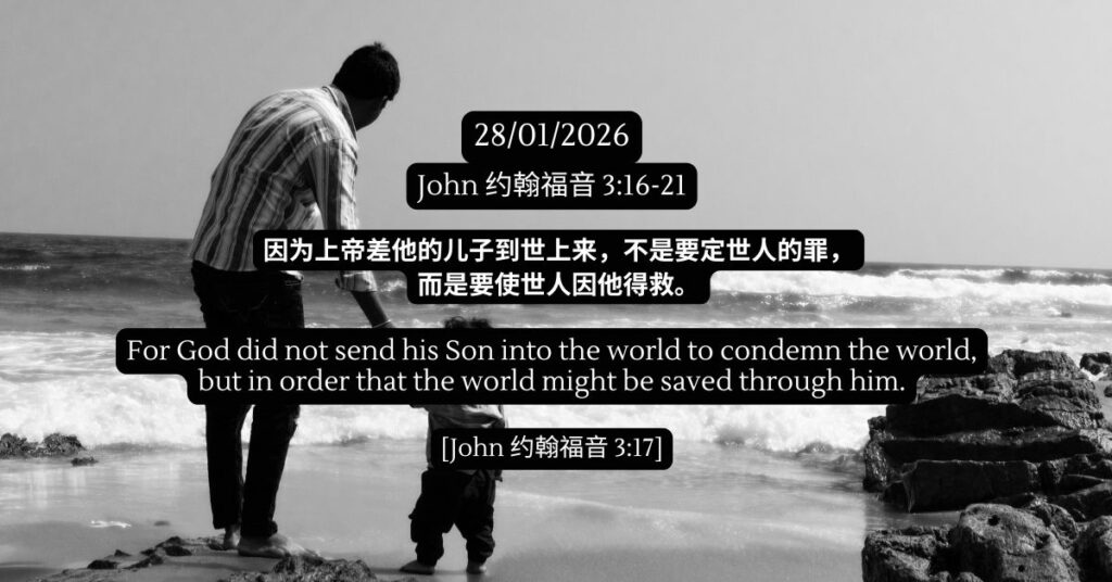 约翰福音 3:16-21 发表评论 / 旧约, 约翰福音, 陪你一起吃灵粮 / 28/01/2026 约翰福音 3:16-21 因为上帝差他的儿子到世上来,不是要定世人的罪,而是要使世人因他得救。。- 约翰福音 3:17