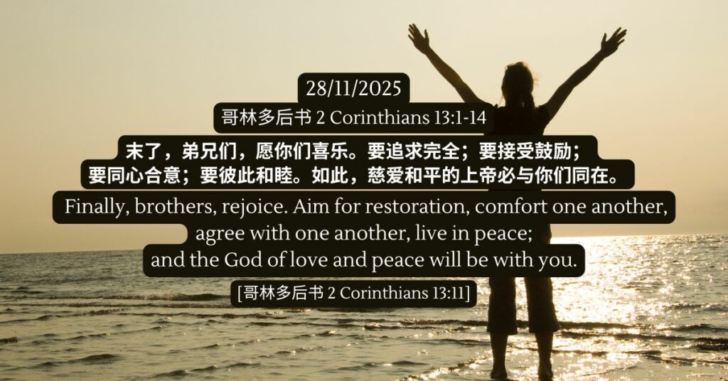 末了,弟兄们,愿你们喜乐。要追求完全;要接受鼓励;要同心合意;要彼此和睦。如此,慈爱和平的上帝必与你们同在。- 哥林多后书 13:11