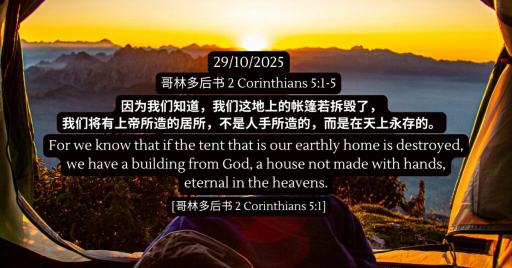 永恒的上帝,感谢祢提醒我们,我们在世的生命不过是帐棚—虽然短暂且脆弱,却稳妥地掌握在祢手中。感谢祢赐予我们属天居所的盼望,并赐下祢的圣灵作为确切的保证。当我们在这个地上帐棚中感到疲惫时,愿祢的圣灵加添我们力量,使我们带着信心、平安和永恒的视角而活。帮助我们轻装前行,有目的地生活,并切切等候那日,就是我们将永远与祢同住的那日。奉耶稣的名祷告,阿们。