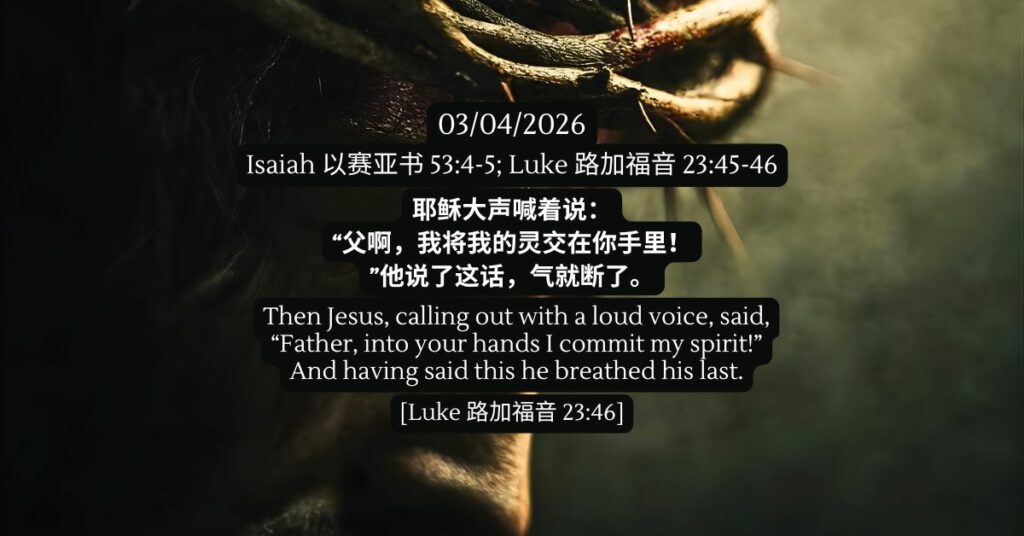 以赛亚书 53:4-5; 路加福音 23:45-46 发表评论 / 以赛亚书, 新约, 旧约, 路加福音, 陪你一起吃灵粮 / 03/04/2026 以赛亚书 53:4-5; 路加福音 23:45-46 耶稣大声喊着说:“父啊,我将我的灵交在你手里!”他说了这话,气就断了。- 路加福音 23:46
