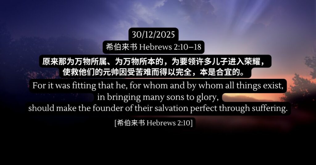 希伯来书 2:10–18 发表评论 / 希伯来书, 旧约, 陪你一起吃灵粮 / 30/12/2025 希伯来书 2:10–18 原来那为万物所属、为万物所本的,为要领许多儿子进入荣耀,使救他们的元帅因受苦难而得以完全,本是合宜的。- 希伯来书 2:10