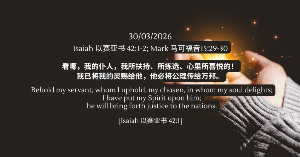 以赛亚书 42:1 42:1-2; 马可福音 15:29-30 发表评论 / 以赛亚书, 新约, 旧约, 陪你一起吃灵粮, 马可福音 / 30/03/2026 以赛亚书 42:1-2; 马可福音15:29-30 看哪,我的仆人, 我所扶持、所拣选、心里所喜悦的! 我已将我的灵赐给他, 他必将公理传给万邦。- 以赛亚书 42:1