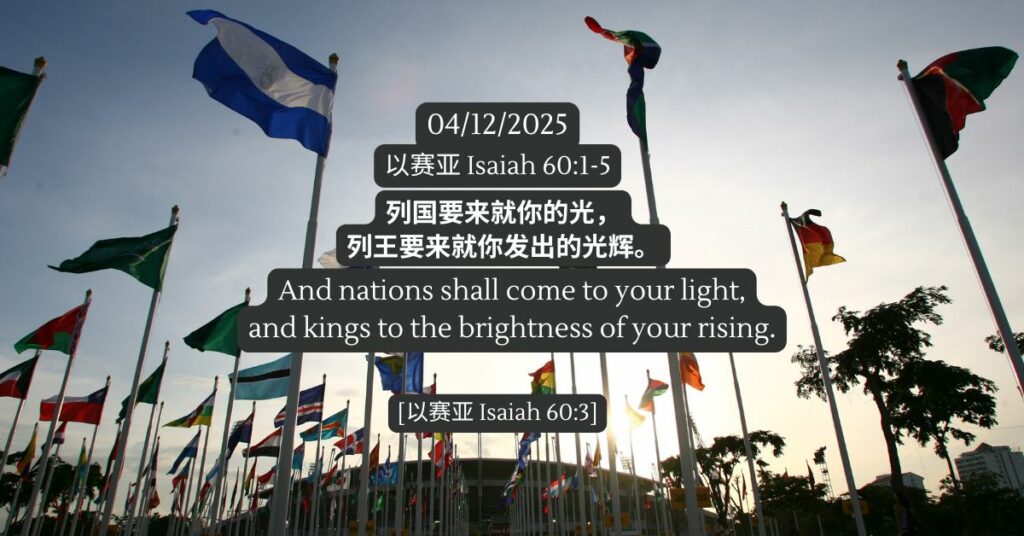 “黑暗笼罩大地,幽暗遮盖万民“(2节上)的时候,”耶和华却要升起照耀你,他的荣光要显在你身上。“(2节下)上帝的荣耀就像出埃及的时候一样(出埃及记10:23),惟独临到锡安,也就是耶路撒冷(2节);成为全地黑暗消失的开始(以赛亚书9:2)。这荣耀将借着锡安向万国彰显,” 列国要来就你的光,列王要来就你发出的光辉“(3节);成就上帝对亚伯拉罕的应许(创世记12:3)。与上帝的心意背道而驰的百姓的生命将要被全然改变!