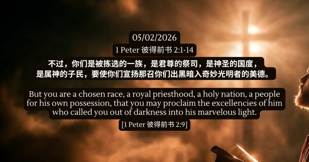 彼得前书 2:1-14 发表评论 / 彼得前书, 旧约, 陪你一起吃灵粮 / 05/02/2026 彼得前书 2:1-14 不过,你们是被拣选的一族,是君尊的祭司,是神圣的国度,是属 神的子民,要使你们宣扬那召你们出黑暗入奇妙光明者的美德。- 彼得前书 2:9