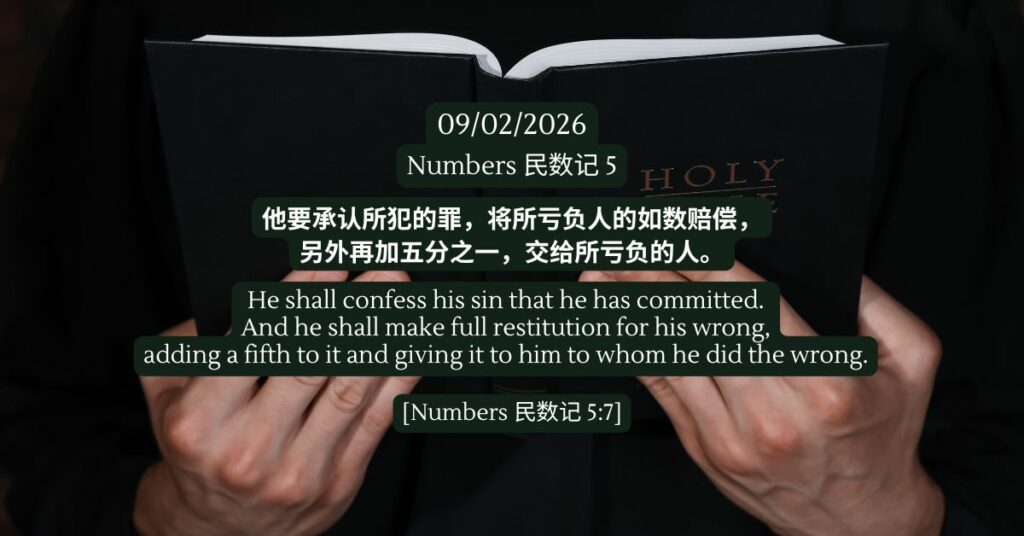 在今日经文的开始,上帝吩咐将不洁净的人暂时安置在营外(1–4节)。这不是要把人排除在外,而是为了保护整个群体,不让不洁在营中传染。接着,经文提到人与人之间发生亏欠,需要承认错误,并做出相应的赔偿(5–10节)。这提醒我们,圣洁不只是属灵层面的事,也包括修复人与人之间的关系,承担对他人造成亏欠的责任。