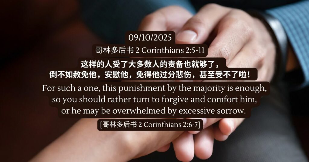 这样的人受了大多数人的责备也就够了,倒不如赦免他,安慰他,免得他过分悲伤,甚至受不了啦!- 哥林多后书 2:6-7