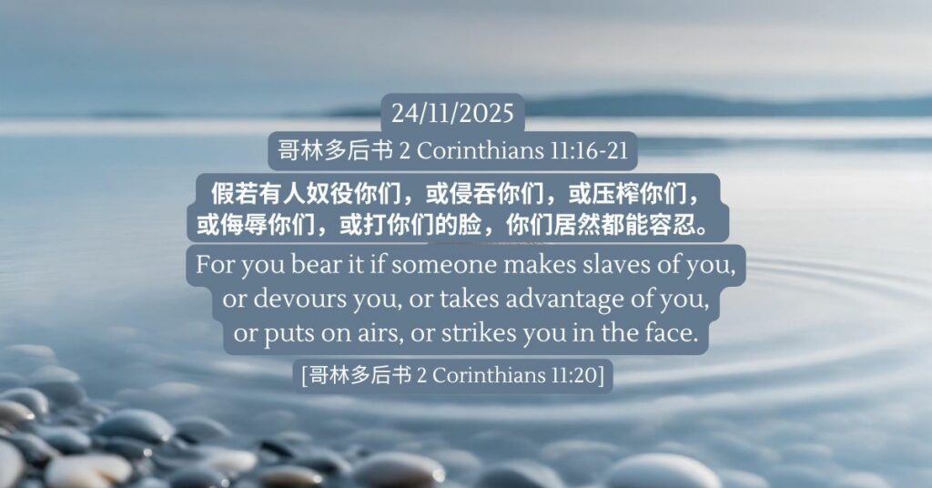 哥林多后书 11:16–21 发表评论 / 哥林多后书, 旧约, 陪你一起吃灵粮 / 24/11/2025 哥林多后书 11:16–21 假若有人奴役你们,或侵吞你们, […] 哥林多后书 11:16–21 Read More »