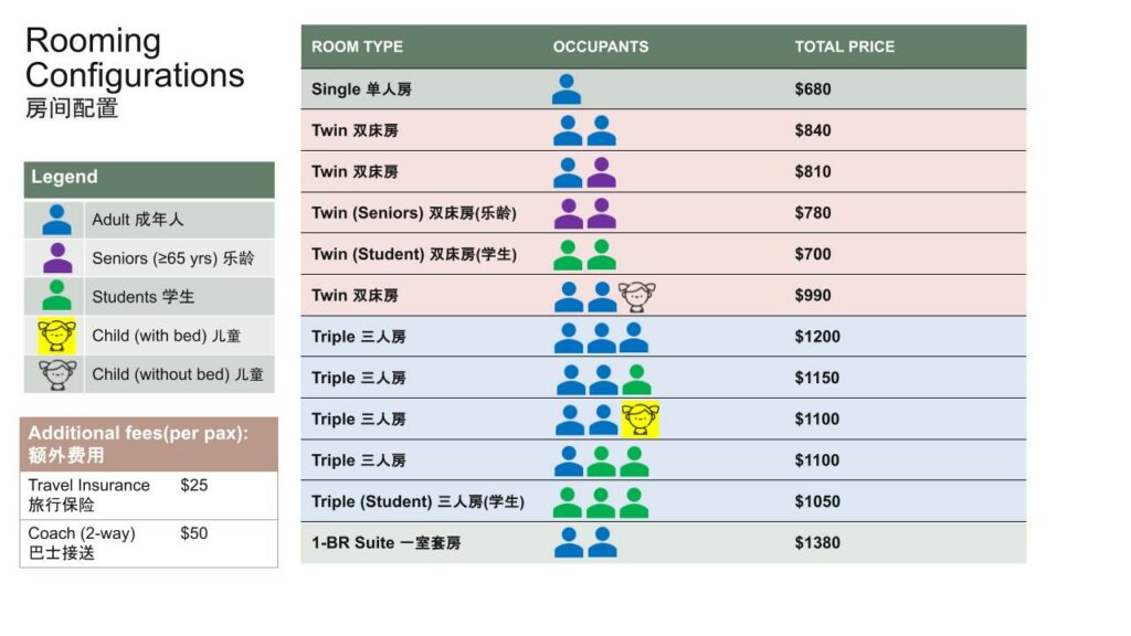 福灵堂联合营会2026 2026年6月11日至14日 @ Courtyard by Marriott (马来西亚, 马六甲) 报名截止2026年3月1日 点击报名表 早鸟优惠价于2025年11月30日结束。 2026 年营会 FMC 常见问题(FAQ) 报名注册: 1. 注册前我需要准备哪些资料?护照号码国籍护照有效e出生日期. 营会 T 恤尺码 孩童 成人 2. 营会费用是多少? 早鸟优惠价 – 2025年9月21日 – 2025年11月30日5 成人 *乐龄 三人房 双人房 单人房 $390 $400 $420 $680 ^一卧室豪华套房 $690 13-18 岁 / 国服 / 全职大专学生 $350 * 仅适用于双人房,65岁以上 ^ 豪华套房数量有限 孩童 3 岁及以下 4 至 12 岁s 无床位 无床位 *有床位 免费 $150 $260 *沙发床及床上用品配件(如枕头、床单、毯子) 正常价格(每人加 $50) – 2025年12月1日 – 2026年3月1日 费用包含: 酒店住宿和会议室、茶歇和部分餐饮、活动项目、1件营会 T 恤、马来西亚文化与旅游税。 费用不包含: 交通和旅游保险。 3. 我想与人同房,但目前没有室友,该怎么办? 如果您找不到双人房的室友,请选择“双人房(请帮我找室友)”。我们将尽力为您安排合适的室 友,请不要预订单人房。 4. 我在注册时填写错误,该怎么办?请发送电邮至 fmc.camp.team@gmail.com,提供您主要注册者的邮箱,并说明需要更正的信息。 5. 我很想参加营会,但负担不起营会费用。可以获得一些帮助吗? 我们非常希望您能来参加营会,并会尽我们所能提供帮助。请写信至 fmc.camp.team@gmail.com或直接联系营会筹委会。 6. 我的护照已过期 / 从入境马来西亚之日起有效期不足6个月,我还能注册吗?可以,您仍然可以使用旧护照信息进行注册,并请在 2026 年 4 月 1 日前将新的护照信息电邮至 fmc.camp.team@gmail.com 7. 我还没有为我的孩子申请护照,我还能注册吗? 可以。您仍然可以注册,在“护照号码”一栏填写“正在申请护照”,在“护照有效期”一栏填写今天的日期。 拿到孩子的护照后,请于 2026 年 4 月 1 日前将护照信息电邮至 fmc.camp.team@gmail.com 8. 我无法参加整个营会。请问我还可以注册吗?费用会减少吗? 您仍然可以注册,但营会费用将维持全额收费。由于酒店费用是按整体安排计算,我们无法退还未使用的部分。 请在注册表格的“住宿需求”栏中注明您将出席的日期和时间。我们鼓励您尽可能多参与营会活动! 9. 我是大专学生,只能在报名截止日期后才知道课程时间表。我还可以报名参加营会吗? 可以。请先完成营会费用付款,并在注册表格的“住宿需求”栏中注明您的学校名称,以及您预计何时会知道课程时间表。 10. 我可以自行安排住宿,然后参加教会营会吗? 不可以。如果您没有入住营会指定的酒店并通过教会正式注册,将无法参加营会。 11. 一份申请表最多可以为几人报名? 每位营员须填写各自的报名表格。如欲与其他人同房,请在报名时注册 “房间负责人(主要联络人)”的姓名。 12. 报名过程中收集的个人资料会如何处理? 根据《个人资料保护法》,FMC 将采取一切合理的安全措施,防止您的个人信息被未经授权地访问、收集、使用、披露、复制、修改或处理 13. 我怎么知道我的注册是否成功? 成功注册后,系统将向主要注册人发送确认电邮。若您未在收件箱中收到,请检查垃圾邮件(Spam)文件夹。 14. 我在注册过程中遇到技术问题,应该怎么办? 请发送电邮至fmc.camp.team@gmail.com 寻求协助。 住宿 1. 提供哪些房型? 营员可选择以下房型: 双人房 – 两张双人床 三人房 – 一张特大床(含一张沙发床) 一卧室豪华套房* – 一张特大床(含额外客厅/餐厅空间) *豪华套房数量有限 2. 我可以申请连通房吗? 可以。您可以在注册表格的“住宿需求”栏中写明此项请求。 但由于连通房数量有限,将优先安排给有年幼孩子的家庭,并不能保证一定能满足您的请求。 请注意,只有**一间特大床房(King Room)和一间双床房(Twin Room)**可以互通。 3. 房间里有婴儿床吗? 有。但酒店提供的婴儿床数量有限,采用先到先得的方式,并免费提供。 如有需要,请在注册时注明。婴儿床仅适用于3岁以下的儿童。 4. 我不确定该为家人预订几间房。 欢迎您在指定主日到交谊厅的报名柜台咨询,我们会为您提供合适的房型建议与配置参考。 付款、取消及退款 1. 我如何支付 2026 年教会营会费用?请通过 PayNow 付款至 FMC 的 UEN 号码,并备注 “REUNION 9XXXXXXX”,然后将付款截图上传至注册表格。或者,您也可以将付款截图发送电邮至fmc.camp.team@gmail.com. 2. 我如何取消教会营会报名?可以申请退款吗? 如需退款,请于 2026 年 3 月 30 日前 将您的营会取消申请发送至 fmc.camp.team@gmail.com2026 年 4 月 1 日后 取消报名将不予退款。 交通 1. 我如何前往教会营会?有没有提供交通? 您可以自行安排交通: 自驾前往马六甲万怡酒店(车程约3至3.5小时) 飞往马六甲机场(请注意,目前Scoot航空在星期二和星期四没有航班) 教会将安排往返巴士接送,费用为每人 $50。 2. 如果我的车还没有获得马来西亚 VEP,我可以开车到营会吗? 在新加坡注册的车辆必须已申请 VEP 并拥有 RFID 标签,方可通过关卡(Tuas 和关口)进入马来西亚。 3. 我自行安排交通。2026 年教会营会什么时候开始和结束? 营会活动将于 2026 年 6 月 11 日下午 1:30 开始。 营会活动预计于 2026 年 6 月 14 日中午 12 点结束(届时不提供午餐)。 4. 马六甲万怡酒店有免费停车位吗? 有。营员车辆只要在酒店登记车牌,便可免费停车。您可在办理入住时登记